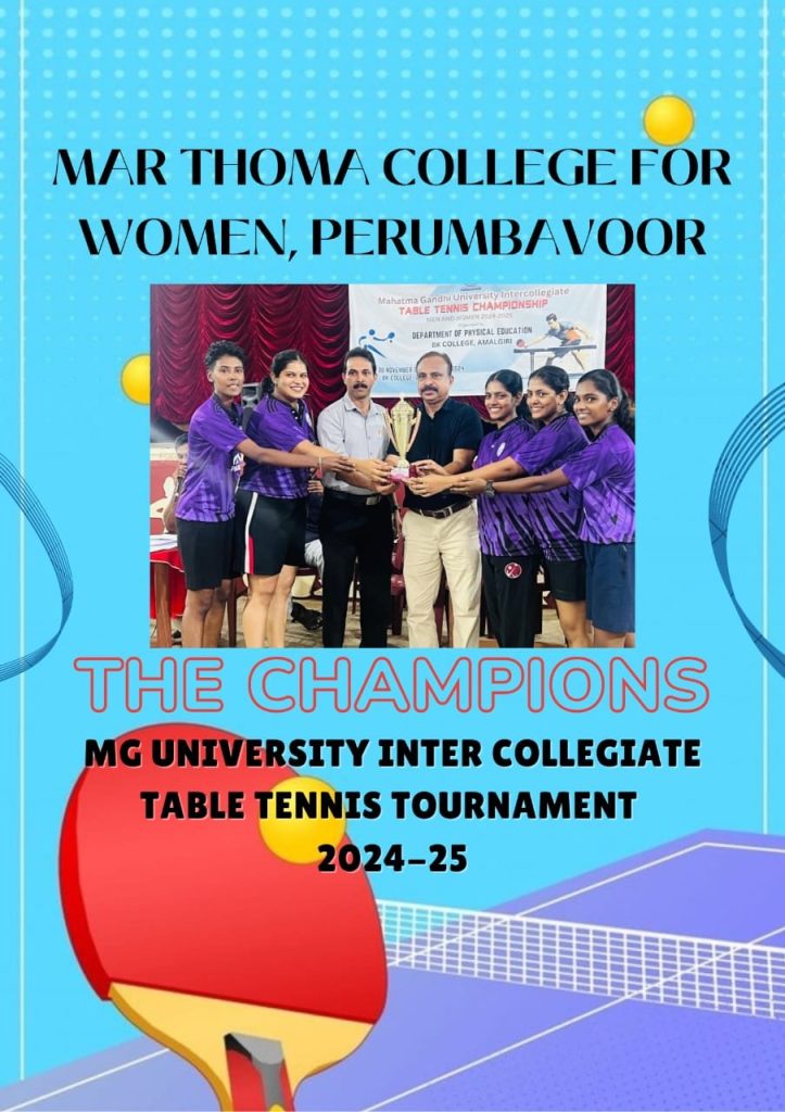 - College Table Tennis team has won the Championship in the M G University inter collegiate Table Tennis Tournament 2024-25. Team members were Ankitha k, Jyothika Hemanth, Anekha K, Aparana Kishore and Saranya M B.