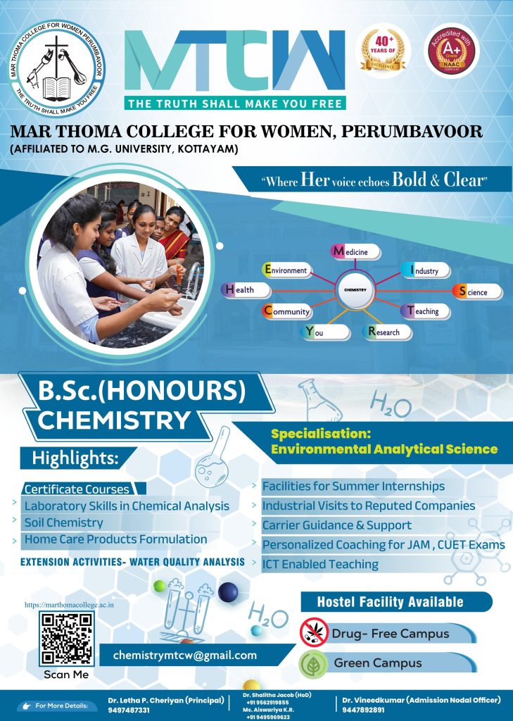 Department of chemistry of Mar Thoma college for women was established in the year 1984.The department offers the B.Sc Chemistry programme under the Choice Based Credit and semester System of the MG University with Mathematics and Physics as complementary Courses. It has excellent four faculties and one non-teaching staff, who are involved in institutional and social responsibilities and the department, conducts different seminars and workshops.